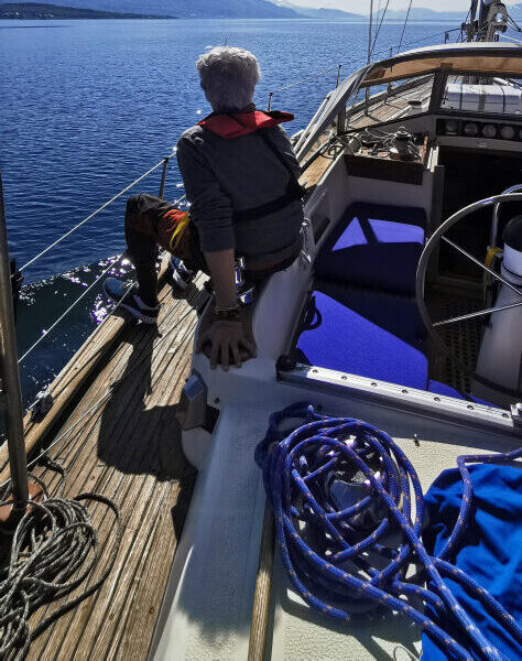 Full safety briefing for all crew. Equipment location, life jacket fitting and tether protocol, emergency procedures, man-overboard drill discussion, flare demonstration, communication plan with shore contact.